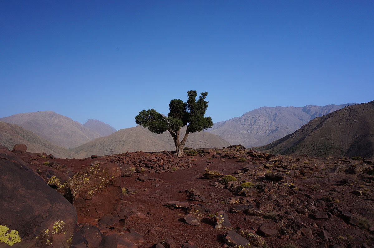 09:00 Transfer zu unserem Ausgangspunkt in Aguersoual (47 km). Dort treffen wir unser Team von Maultiertreibern und Koch. Nach einem Mittagessen an einem schattigen Platz starten wir unser Trekking. Über die Berber-Dörfer Tissgharine und Matat erreichen wir unser Camp auf dem Tifirt Plateau (1800 m), von wo wir bei schönem Wetter in der Ferne die glitzernden Lichter Marrakeschs sehen können.